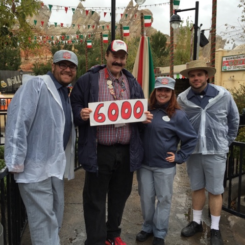 At 2:25pm, My cast member friends, Carlene, Catalina, Ruth and Jessica, joined Jamie and I at GWD. We all got into Teal 2. We were on the Luigi's side for race. And we lost on lap 6000. I usually lose on the big laps. All that matters, is that I got to ride with my friends. Jamie even got a video of the race with my GoPro camera. After we got out of the car, we got a group photo. One normal and one goofy. I'm always the lucky one who gets to ride with his cast member friends on the big laps. They are the best. I want to thank the Photopass cast members who gave us the ride photos. I also took photos with my friends, Sandra, Dorise and Mike, who came to celebrate the ride with me. We also met Heather and got a selfie. I took a break to get a bite to eat. We then all went on Racers. Single rider line. My 6001 lap. I then went with Heather and Dorise on Tower of Terror. Back to Racrrs for 5 more laps. Ended the day at 6006. Good number to stop on. Back at Racers on Wednesday to start and race to a new goal. I want to hit 7000 rides on my Birthday. Four months from now.