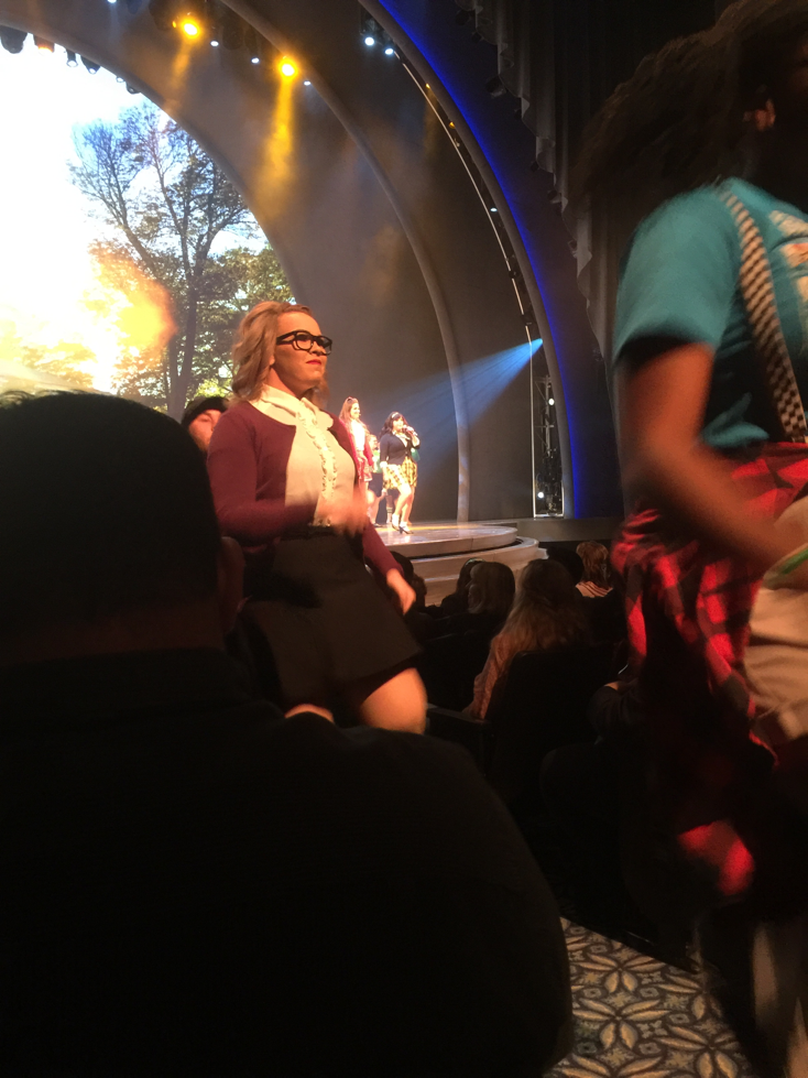 I got to the Hyperion Theatre inside DCA at about 7pm. I met Teara and one of her friends in line to get in. I then got a text from my friend Carlene, saying " I see you". She was in line behind me. So I invited her and her 2 friends to join us. We were able to sit with each other for the show. Carlene sat on the aisle but got a little freaked out when the performers came down the aisle by us.